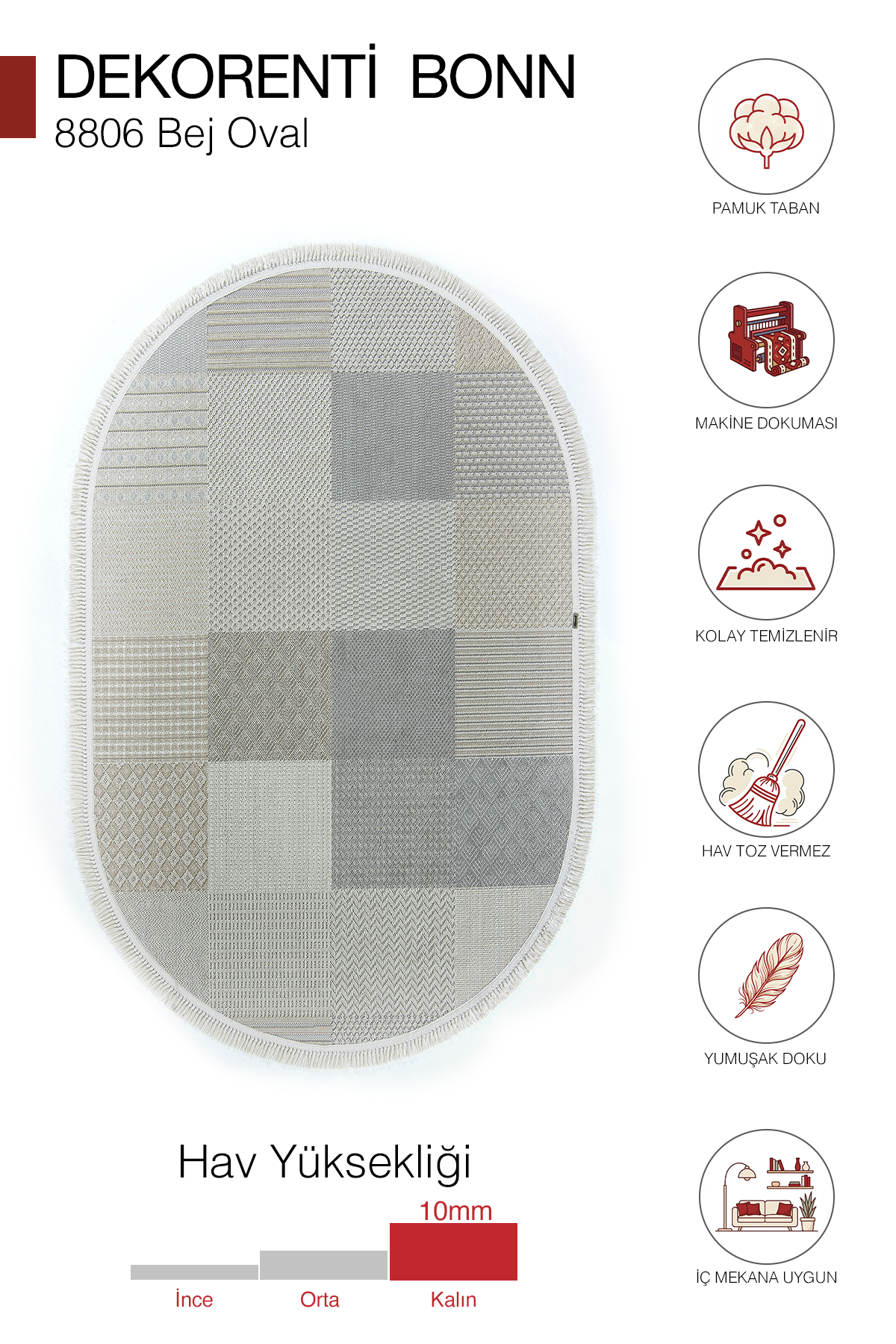 10 mm hav yüksekliği ile yumuşak ve konforlu bir zemin hissi sunar. Polyester iplik yapısı sayesinde tozumaz yapıda, dayanıklı, kolay temizlenebilir ve günlük kullanıma uygundur. Pamuk tabanı, örgü saçak yapısı ve 1.750 gr ağırlığı ile hafif, pratik ve uzun ömürlü bir kullanım sağlar.