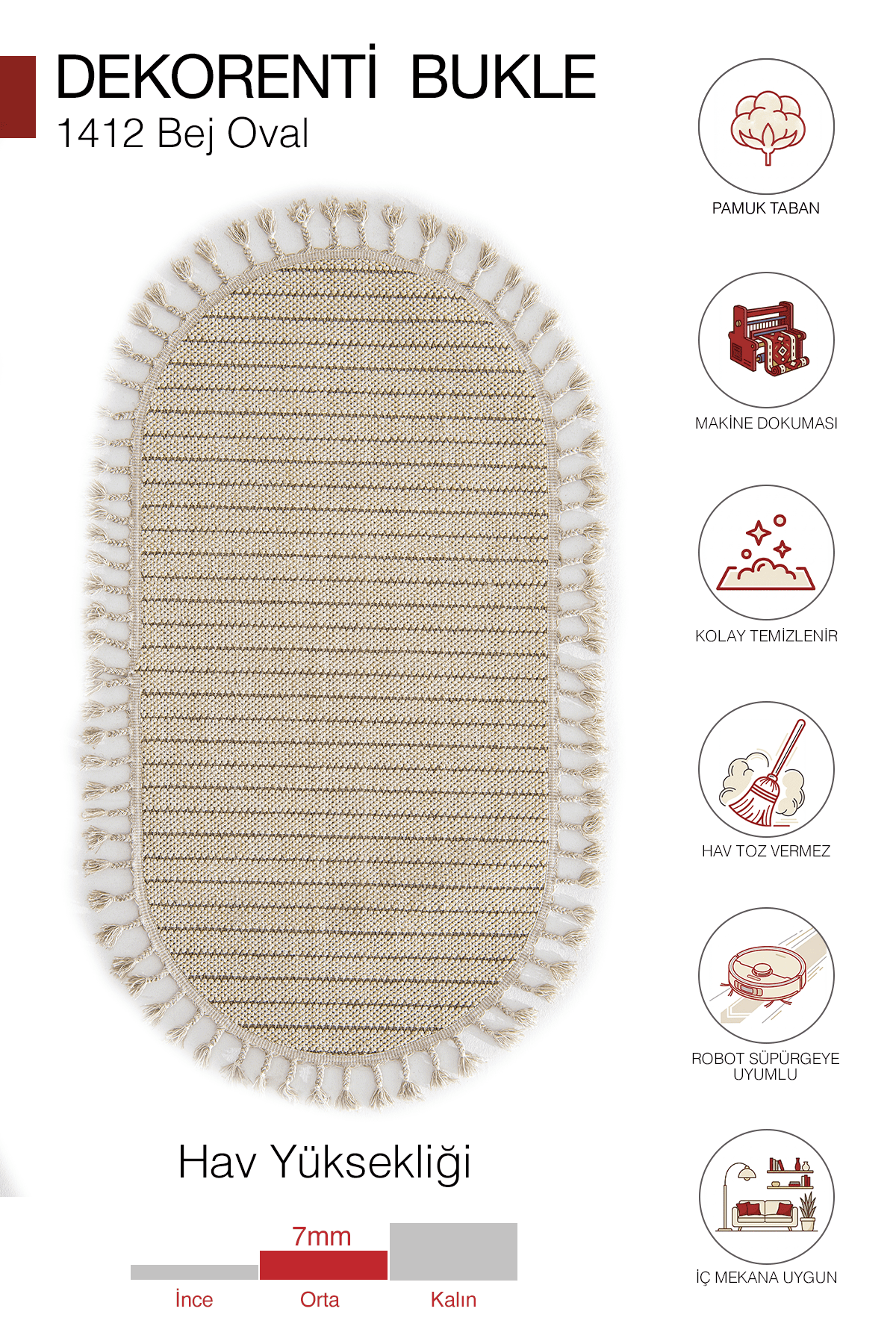 Bukle dokuma yapısı sayesinde yüzeyde doğal bir doku hissi sunar. Dayanıklı iplik yapısı ile uzun ömürlü kullanım sağlar. Pamuk tabanı ve örgü saçak yapısı ile hem estetik hem de konforlu bir kullanım sunar.