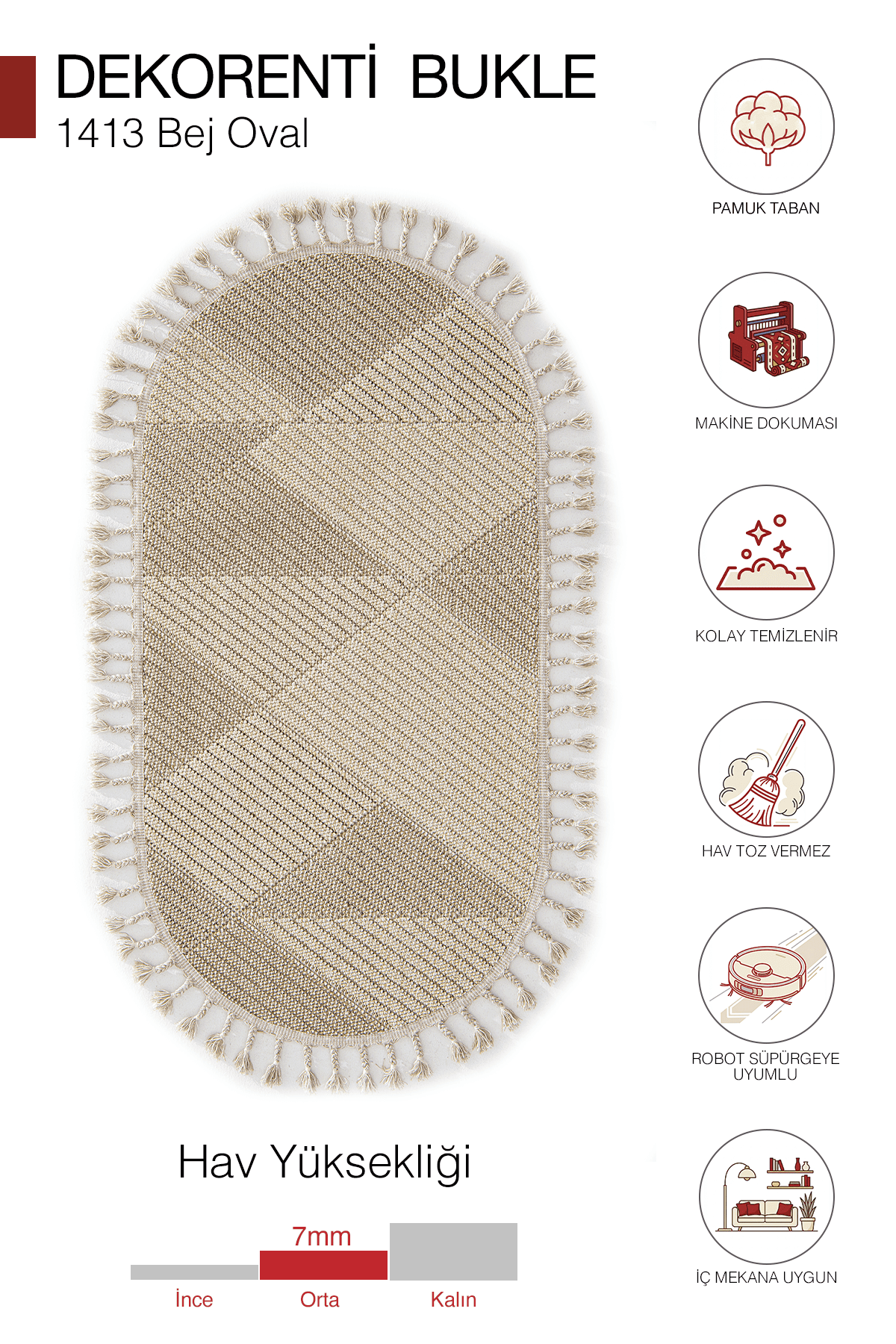 Bukle dokuma yapısı sayesinde yüzeyde doğal bir doku hissi sunar. Dayanıklı iplik yapısı ile uzun ömürlü kullanım sağlar. Pamuk tabanı ve örgü saçak yapısı ile hem estetik hem de konforlu bir kullanım sunar.