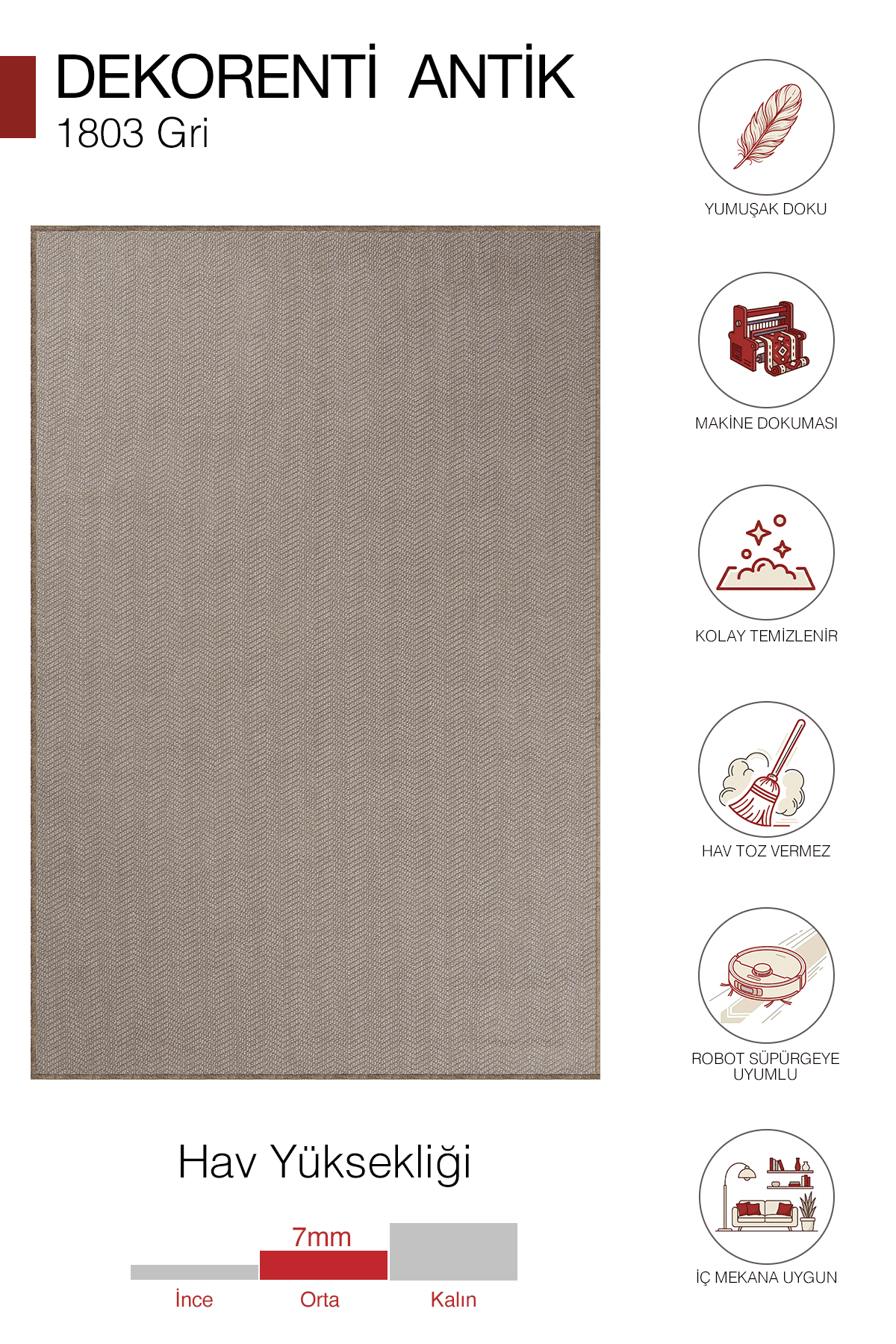 Dekorenti Antik 1803 Gri tonunun zamansız şıklığı ve tok dokusuyla yaşam alanlarında konforlu ve dengeli bir atmosfer oluşturur. 7 mm hav yüksekliği günlük kullanım için ideal konfor sunar. Jut tabanı sayesinde zemine sağlam tutunur; saçaksız çoban dikişli kenar yapısı modern ve düzenli bir bitiş sağlar. Polyester iplik dokusu uzun ömürlü ve pratiktir. 2000 gr ağırlığı ile tok ve kaliteli bir duruş sunar.