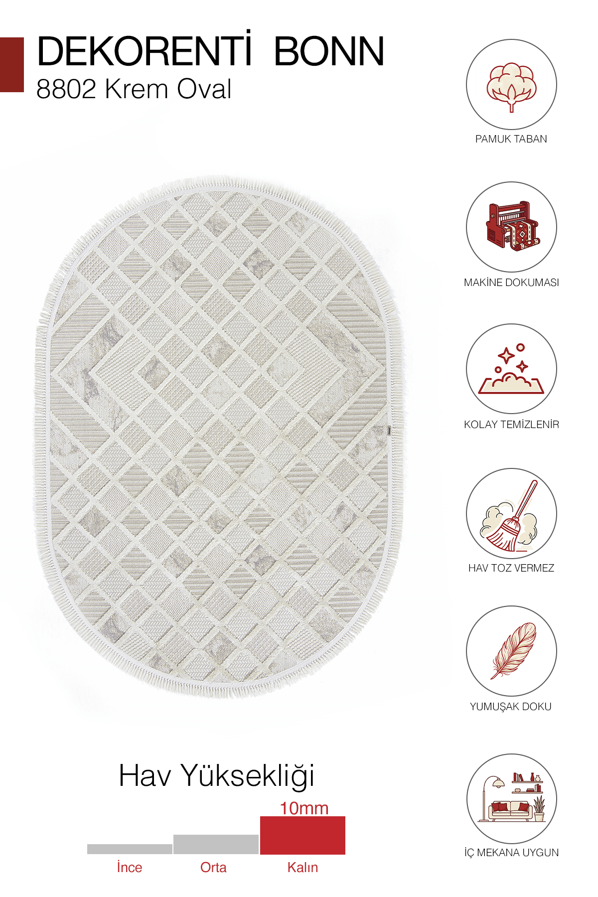 10 mm hav yüksekliği ile yumuşak ve konforlu bir zemin hissi sunar. Polyester iplik yapısı sayesinde tozumaz yapıda, dayanıklı, kolay temizlenebilir ve günlük kullanıma uygundur. Pamuk tabanı, örgü saçak yapısı ve 1.750 gr ağırlığı ile hafif, pratik ve uzun ömürlü bir kullanım sağlar.