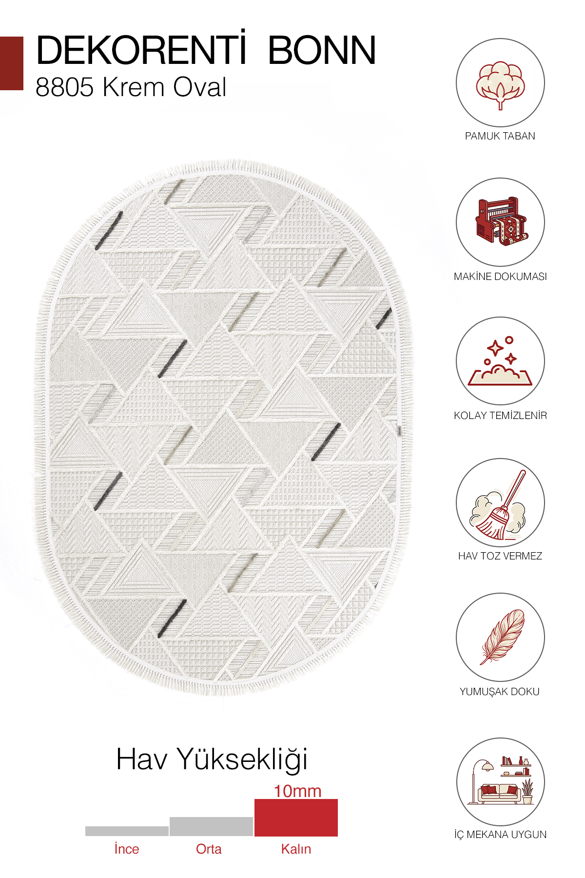 10 mm hav yüksekliği ile yumuşak ve konforlu bir zemin hissi sunar. Polyester iplik yapısı sayesinde tozumaz yapıda, dayanıklı, kolay temizlenebilir ve günlük kullanıma uygundur. Pamuk tabanı, örgü saçak yapısı ve 1.750 gr ağırlığı ile hafif, pratik ve uzun ömürlü bir kullanım sağlar.
