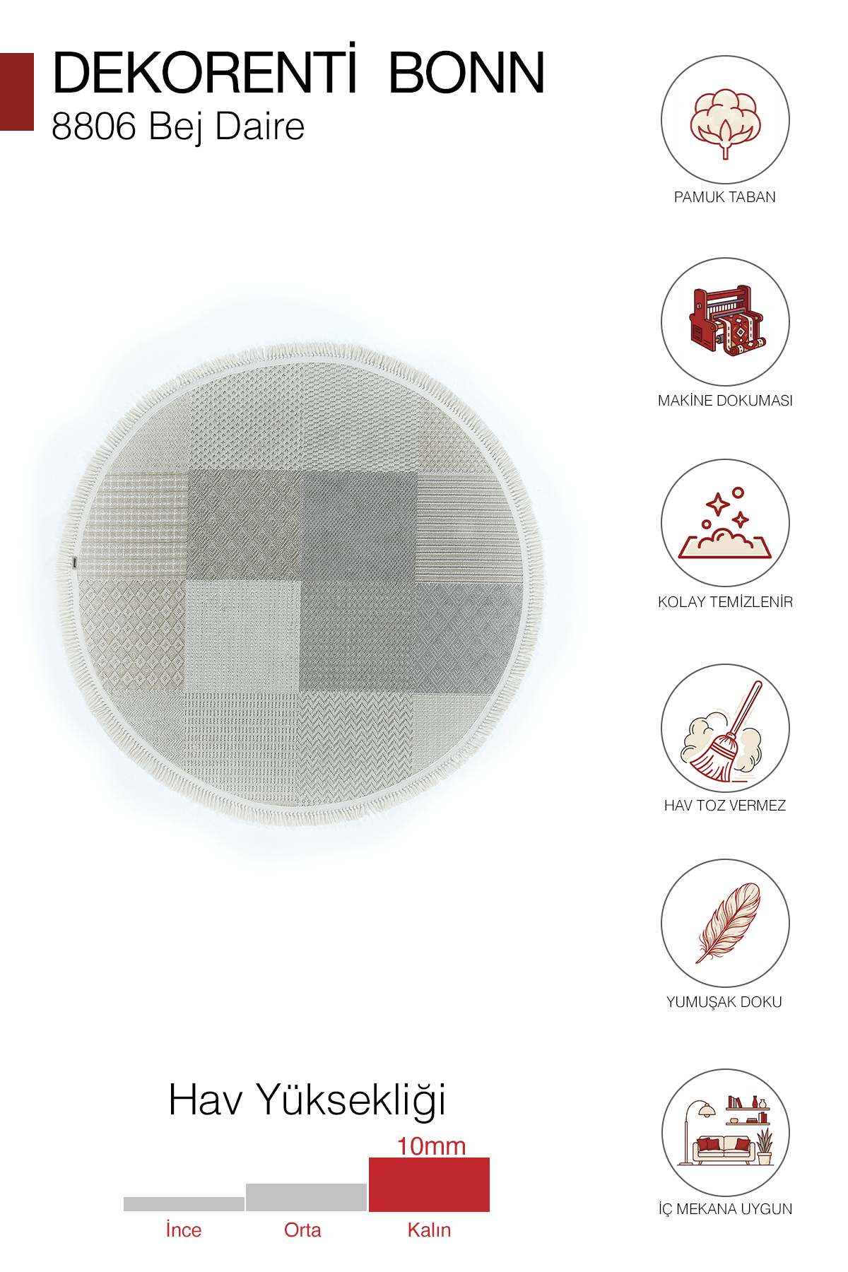 10 mm hav yüksekliği ile yumuşak ve konforlu bir zemin hissi sunar. Polyester iplik yapısı sayesinde tozumaz yapıda, dayanıklı, kolay temizlenebilir ve günlük kullanıma uygundur. Pamuk tabanı, örgü saçak yapısı ve 1.750 gr ağırlığı ile hafif, pratik ve uzun ömürlü bir kullanım sağlar.