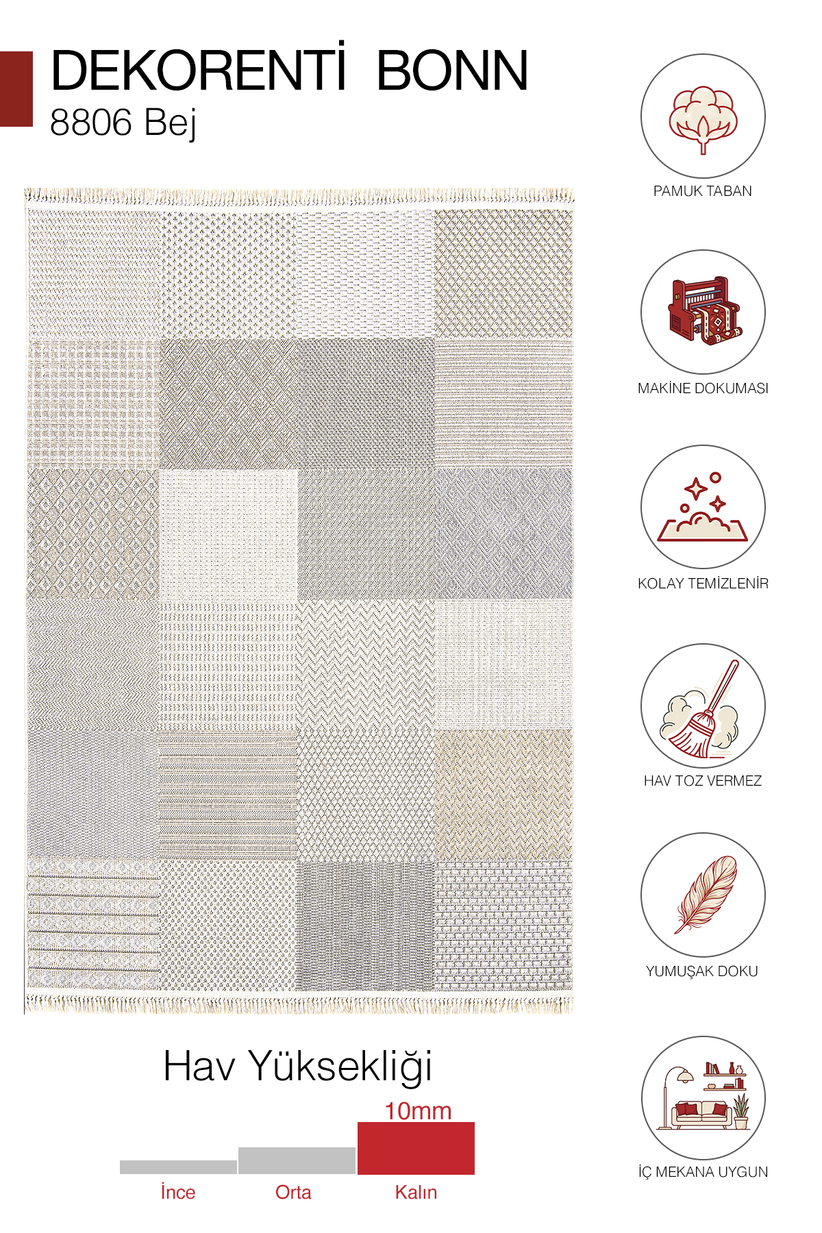 10 mm hav yüksekliği ile yumuşak ve konforlu bir zemin hissi sunar. Polyester iplik yapısı sayesinde tozumaz yapıda, dayanıklı, kolay temizlenebilir ve günlük kullanıma uygundur. Pamuk tabanı, örgü saçak yapısı ve 1.750 gr ağırlığı ile hafif, pratik ve uzun ömürlü bir kullanım sağlar.