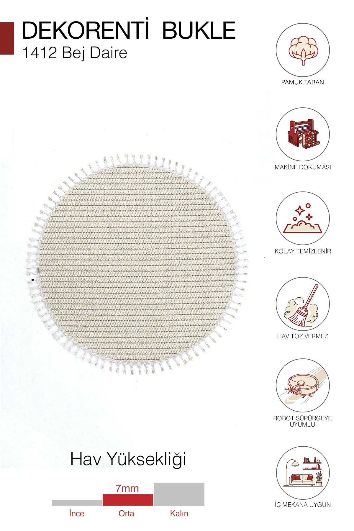 Bukle dokuma yapısı sayesinde yüzeyde doğal bir doku hissi sunar. Dayanıklı iplik yapısı ile uzun ömürlü kullanım sağlar. Pamuk tabanı ve örgü saçak yapısı ile hem estetik hem de konforlu bir kullanım sunar.