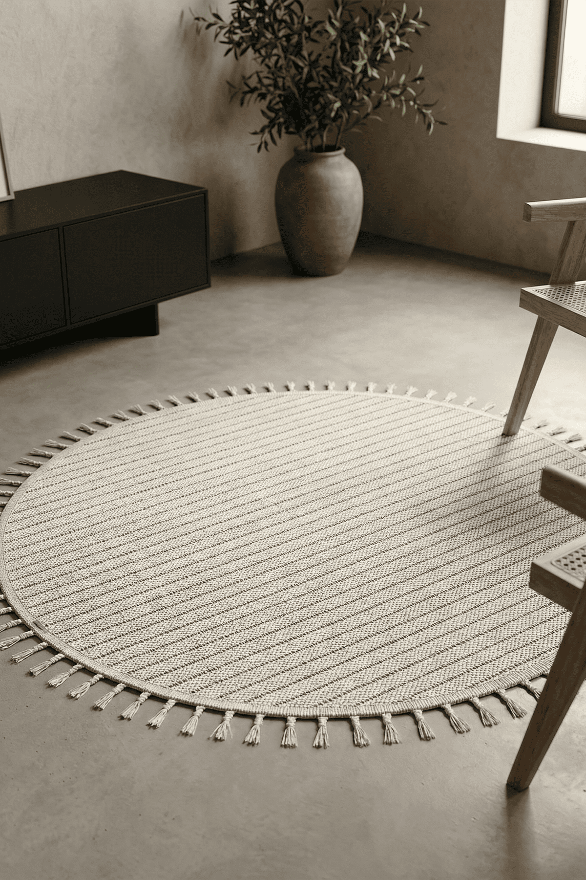 Dekorenti Bukle 1412 Bej Daire Halı, düz ve çizgisel dokuma yapısı ile modern dekorasyona sade ve şık bir görünüm kazandırır. Bej tonları sayesinde mekânı daha ferah, aydınlık ve sıcak gösterir.