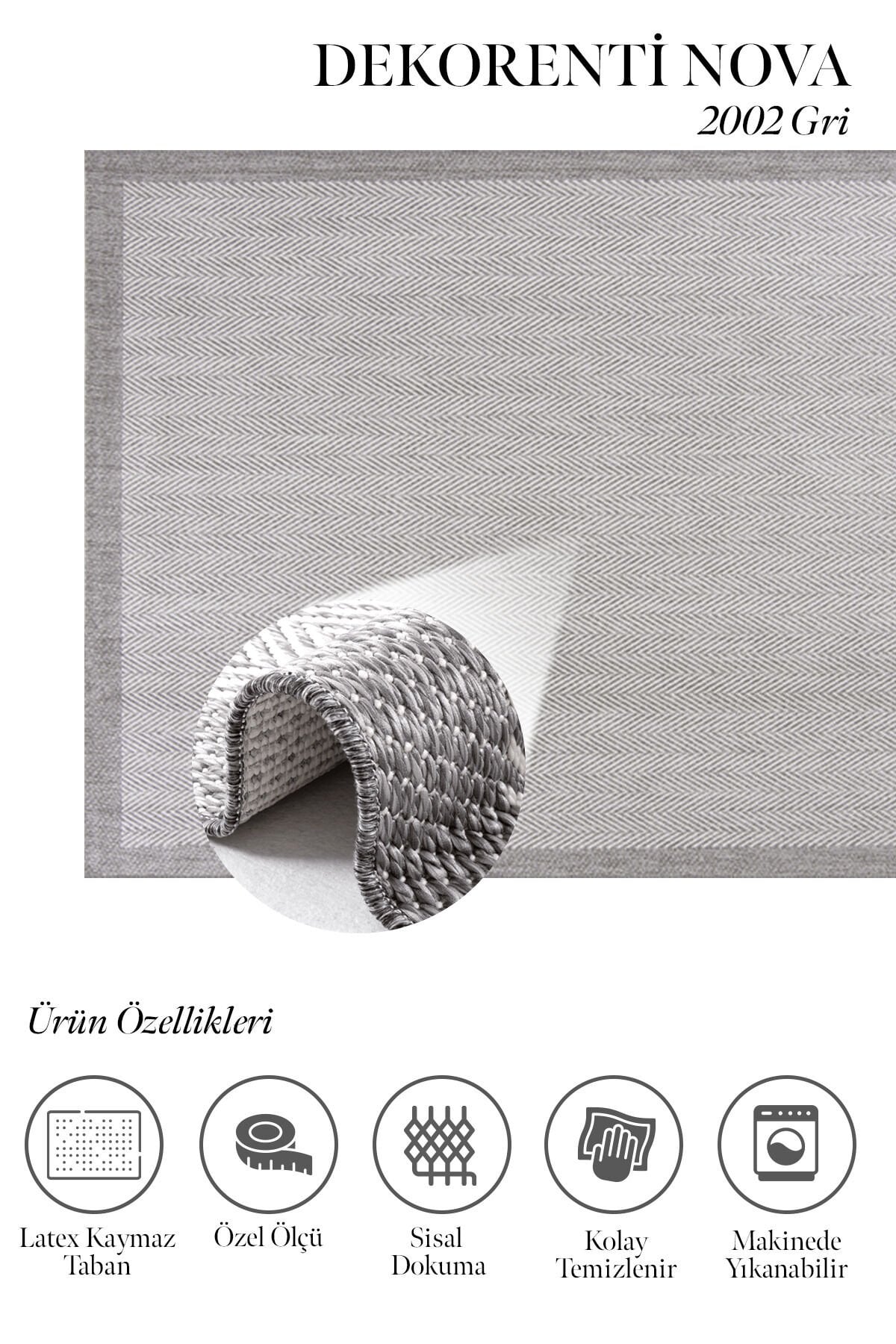 Dekorenti Nova 2002 Gri, modern çizgileri ve sade yüzey dokusuyla günlük kullanım alanlarında şıklık ve pratikliği bir araya getiren özel bir sisal halı modelidir. Gri tonlarının dengeli ve zamansız görünümü sayesinde özellikle mutfak, koridor, balkon ve banyo gibi alanlarda modern bir atmosfer oluşturur.