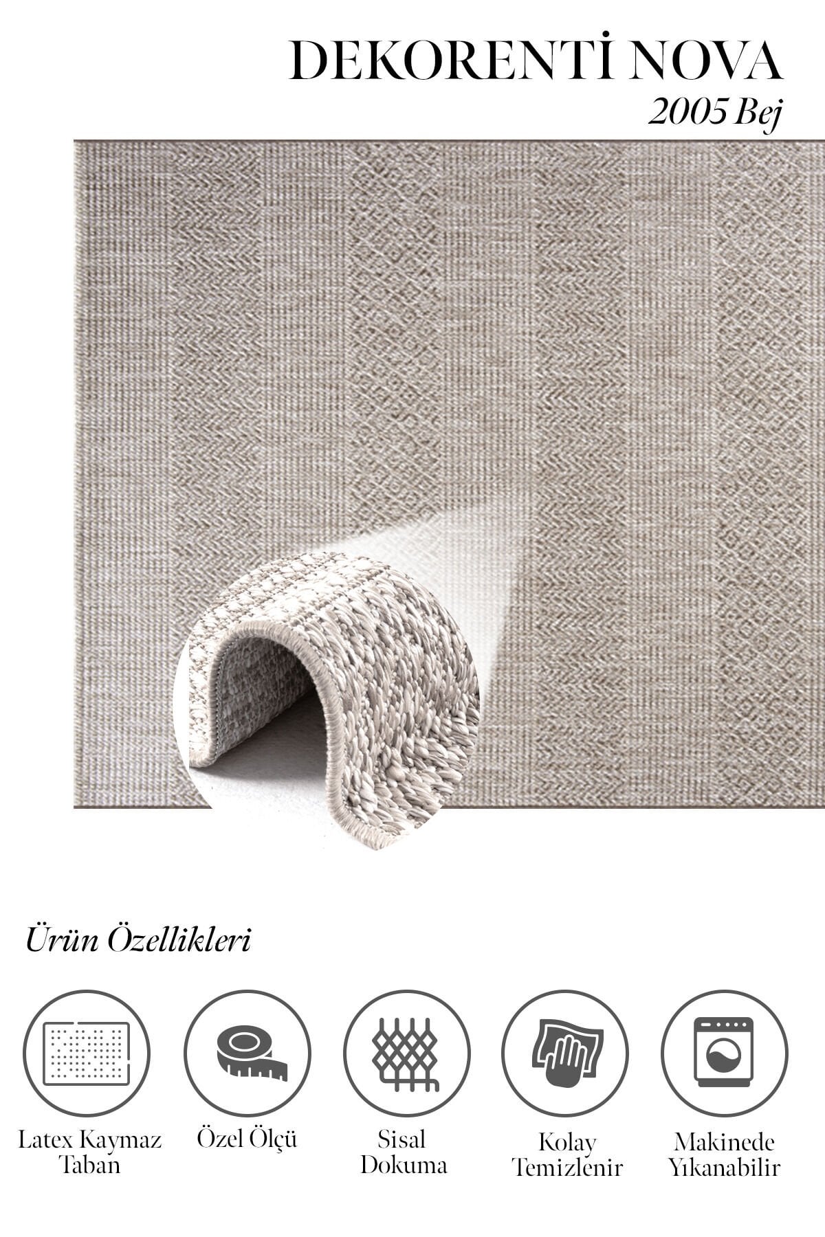 Dekorenti Nova 2005 Bej, sade yüzey yapısı ve ince dokulu doğal görünümüyle günlük kullanım alanlarında şıklığı ve pratikliği bir araya getiren modern bir sisal halı modelidir. Açık bej tonları sayesinde bulunduğu alana ferahlık kazandırır ve özellikle mutfak, balkon, banyo ve koridor gibi alanlarda rahatlıkla kullanılabilir.