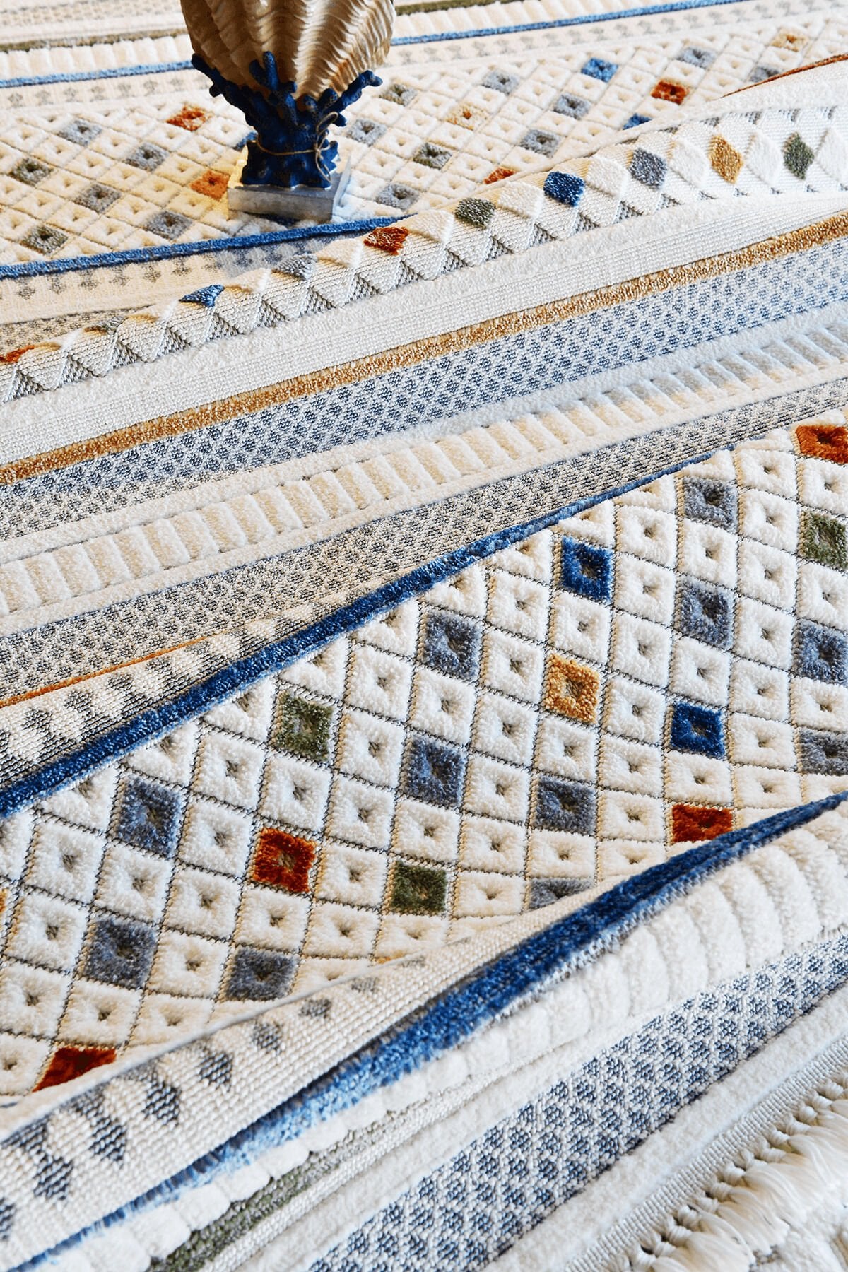 Dekorenti Polo Serisi, modern yaşam alanlarına hareket, enerji ve sıcaklık katmak isteyenler için tasarlanmış özel bir halı koleksiyonudur. Açık zemin üzerine uygulanan renkli geometrik desenleri, çizgisel dokuları ve bohem esintili tasarım detayları sayesinde ev dekorasyonunda hem dikkat çekici hem de ferah bir görünüm oluşturur.