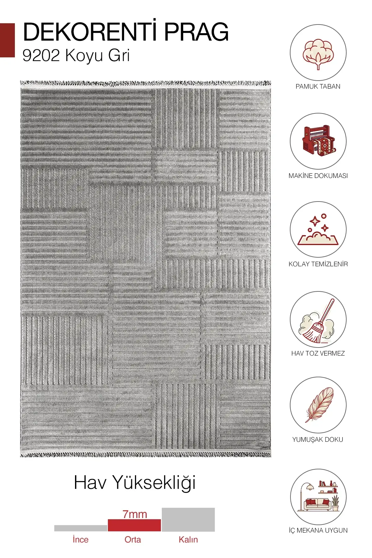 Paylaştığın desenlerde öne çıkan çizgili dokular ve minimal geometrik formlar, halıya “tok ama sade” bir duruş verir. Krem, bej, açık gri ve koyu gri renk seçenekleri; salon, oturma odası, mutfak ve koridor gibi alanlarda kolay kombinlenir.