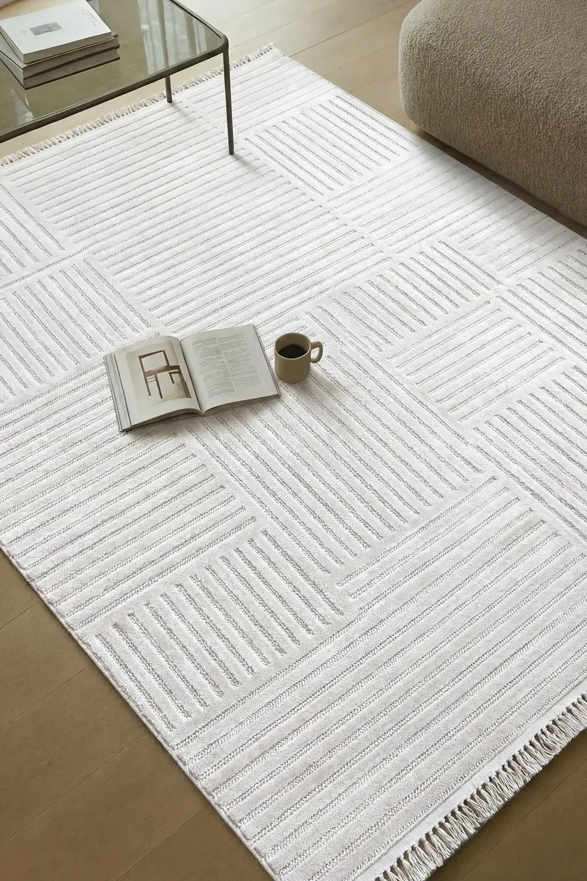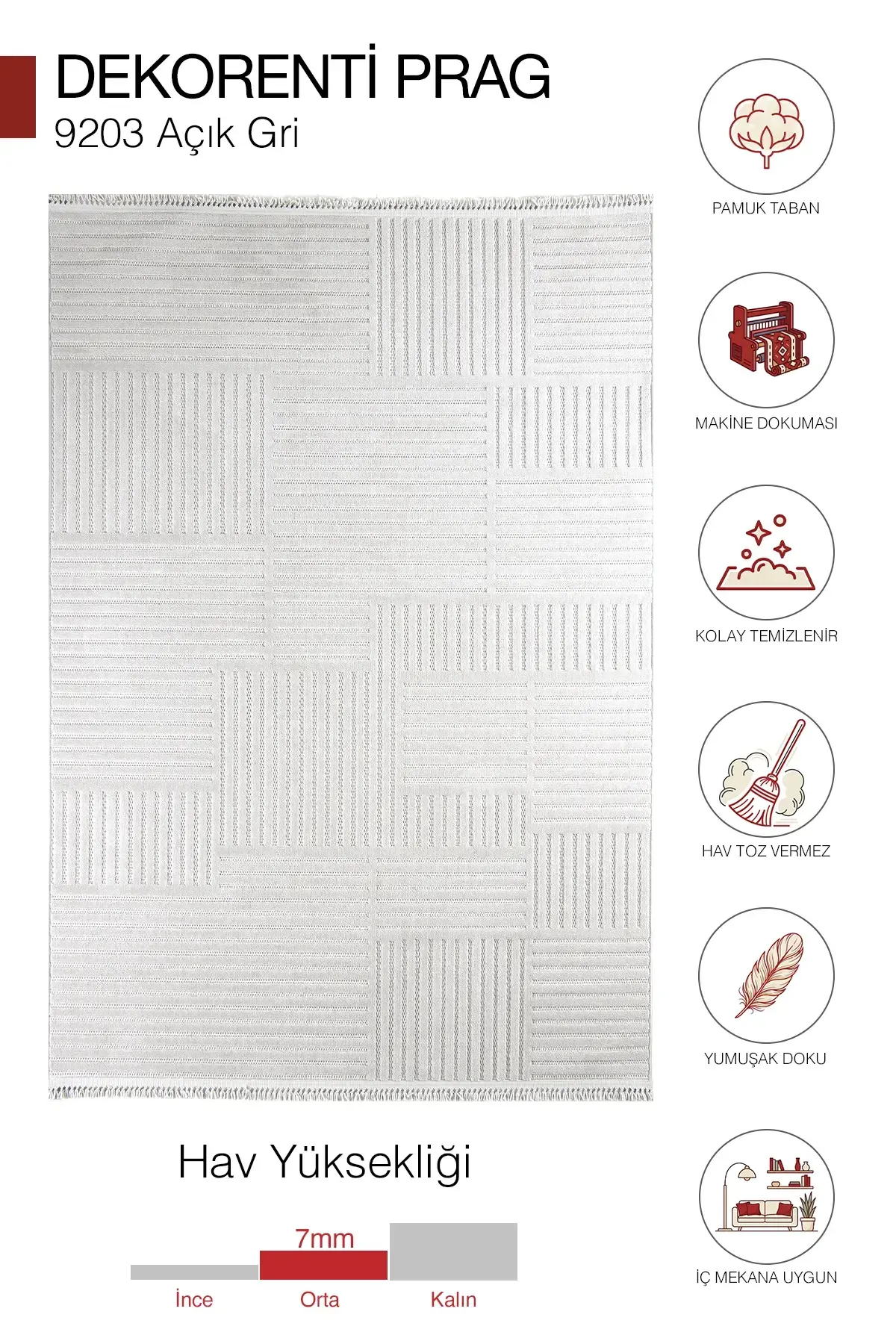 Paylaştığın desenlerde öne çıkan çizgili dokular ve minimal geometrik formlar, halıya “tok ama sade” bir duruş verir. Krem, bej, açık gri ve koyu gri renk seçenekleri; salon, oturma odası, mutfak ve koridor gibi alanlarda kolay kombinlenir.