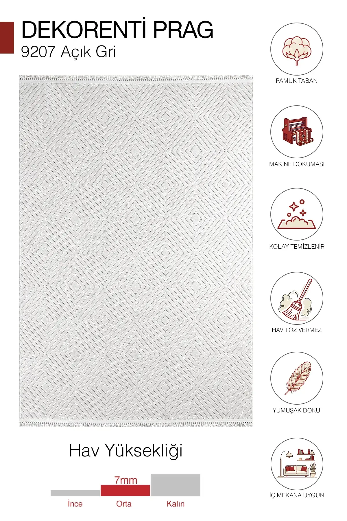 Polyester iplikten üretilen yüzeyi dayanıklı ve günlük kullanıma uygundur. Pamuk tabanı sayesinde zemine daha iyi oturur, konforlu bir kullanım sunar. Örgü saçak detayı ise doğal ve modern bir bitiş sağlar.