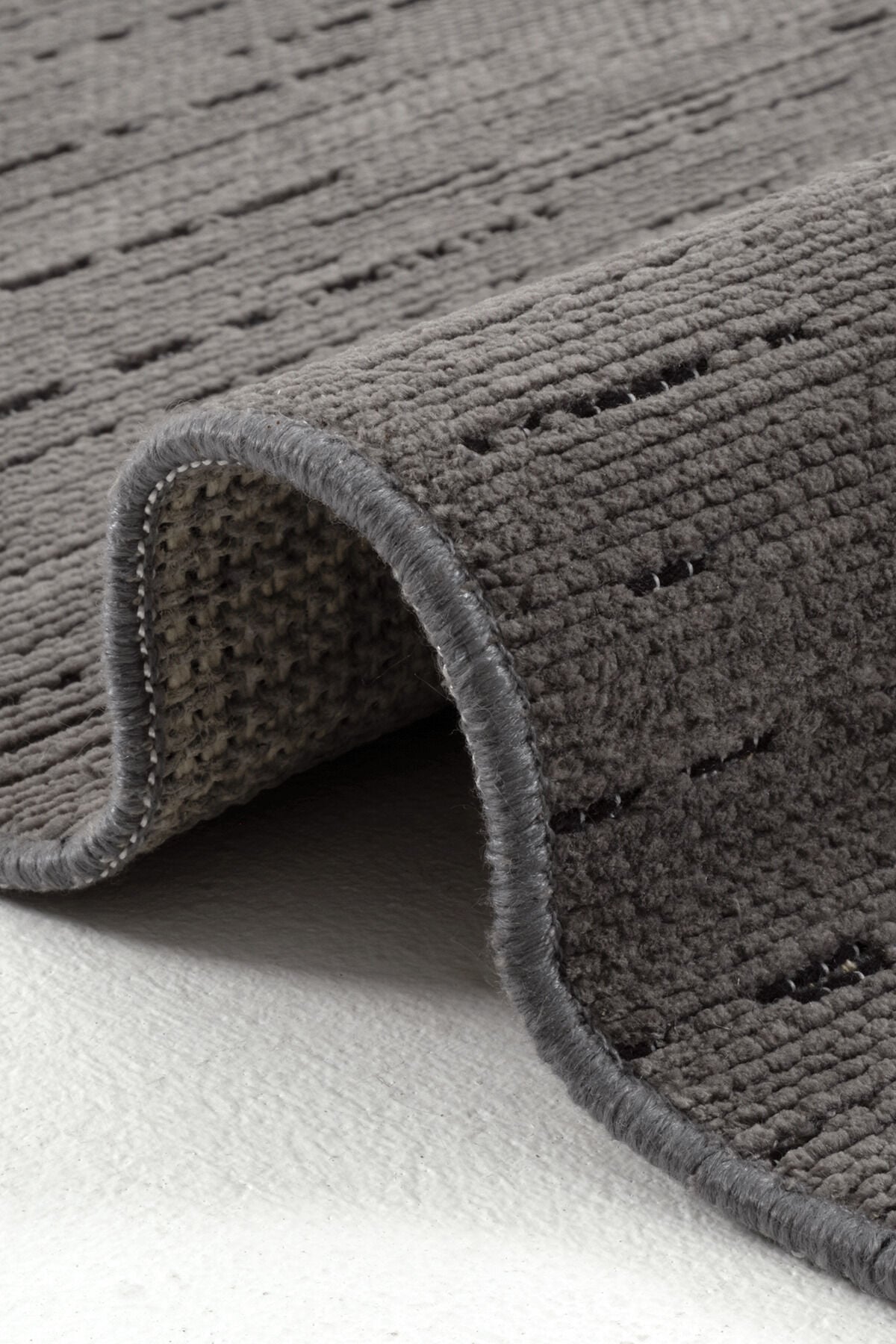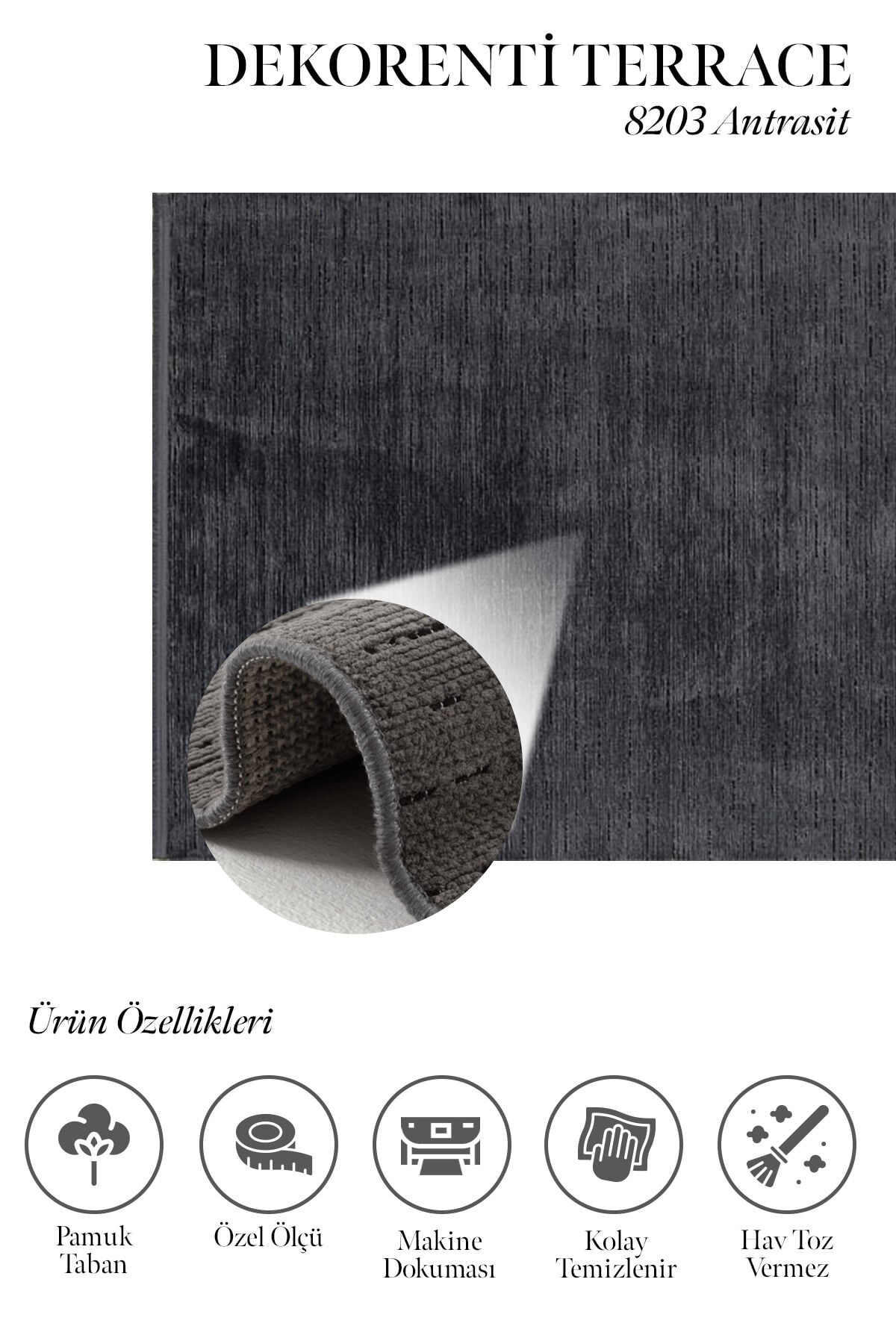 Dekorenti Terrace 8203 Antrasit düz saçak detayı ve yan kenarlardaki sağlam dikiş yapısı, Terrace Serisi’ne modern ve düzenli bir görünüm kazandırırken uzun ömürlü kullanım avantajı sağlar. Ayrıca kolay temizlenebilir yapısı, tozumaz özelliği ve hav-tüy çıkarmayan dokusu sayesinde hem şık hem de kullanışlı bir halı arayanlar için ideal bir seçimdir.