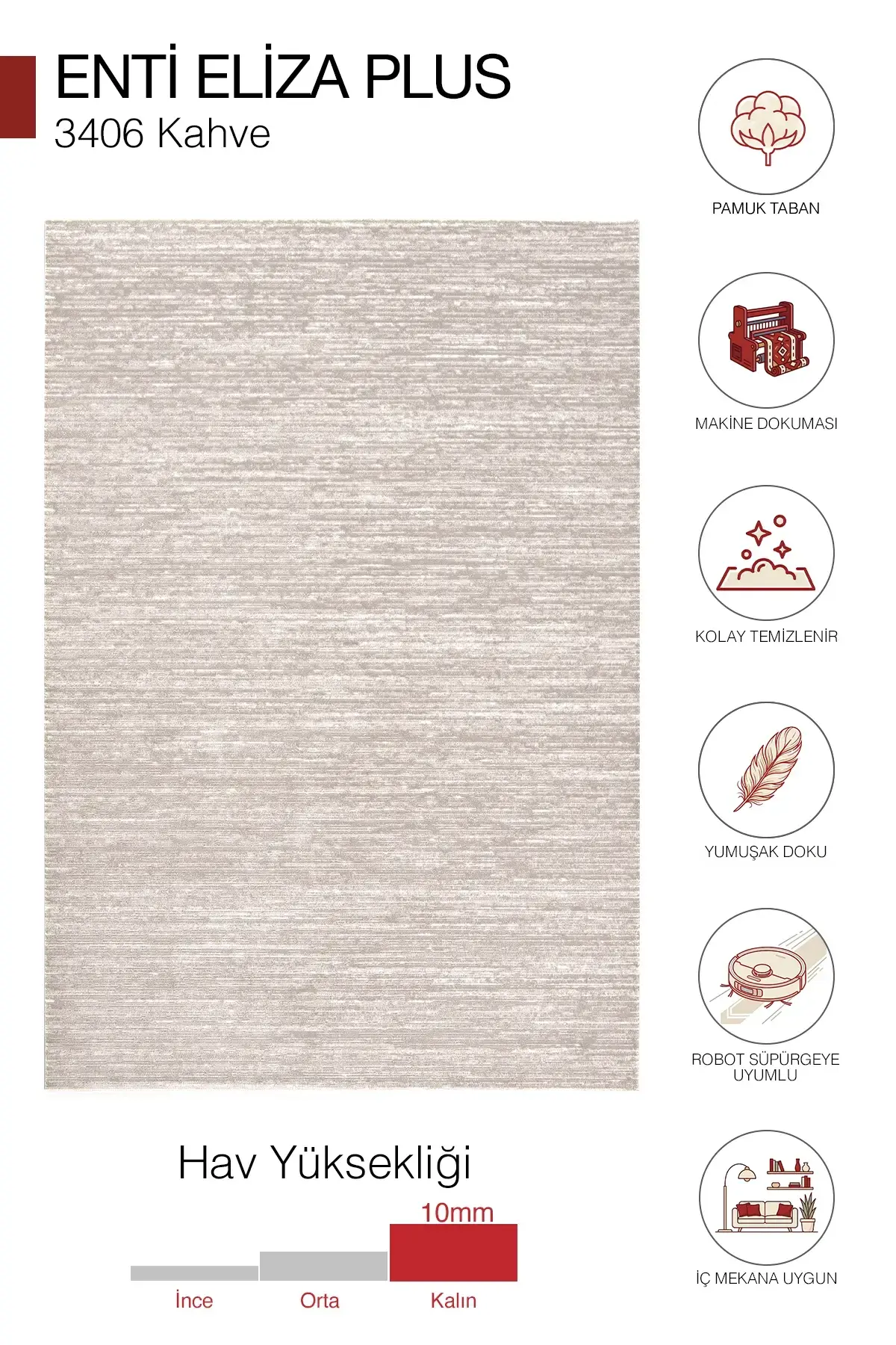 10 mm hav yüksekliği ile dolgun ve konforlu bir kullanım sunan Eliza Plus Serisi, 2150 gr ağırlığı sayesinde güçlü ve premium bir duruş sergiler. Günlük kullanıma uygun, kolay temizlenebilir ve formunu uzun süre koruyan dokuması sayesinde yalnızca salon ve oturma odalarında değil; koridor, antre ve mutfak gibi yoğun kullanılan alanlarda da güvenle tercih edilebilir. Ev yaşamında konforu ve şıklığı bir arada sunar.