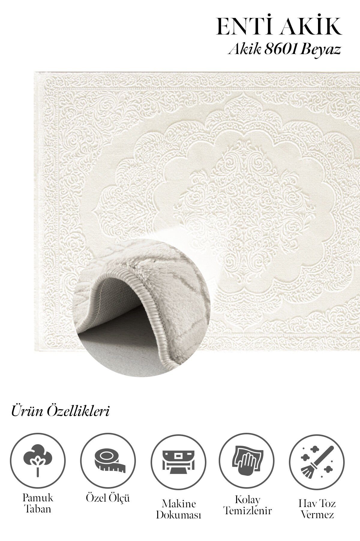 Enti Akik 8601 Beyaz, Akrilik iplik yapısı sayesinde hem şık bir duruş hem de konforlu bir kullanım sunan Akik Koleksiyonu, 11 mm hav yüksekliği ile adım attığınız anda yumuşaklık hissini yaşatır. Pamuk tabanı, zemine daha dengeli oturmasına yardımcı olurken kullanım konforunu artırır. Düz saçak detayı ise ürüne sade, modern ve temiz bir görünüm kazandırır.