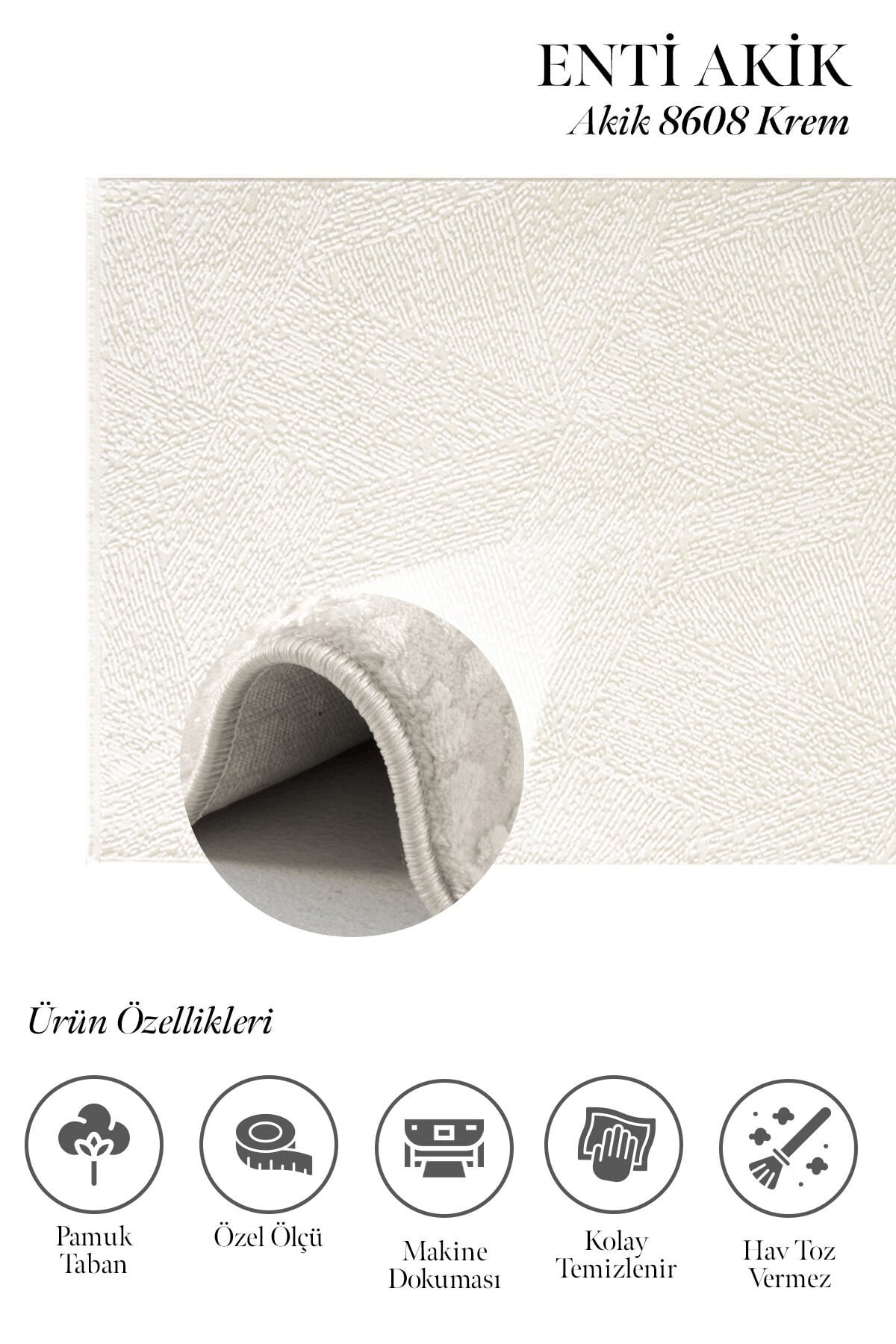 Akrilik iplik yapısı sayesinde hem şık bir duruş hem de konforlu bir kullanım sunan Enti Akik 8608 Krem, 11 mm hav yüksekliği ile adım attığınız anda yumuşaklık hissini yaşatır. Pamuk tabanı, zemine daha dengeli oturmasına yardımcı olurken kullanım konforunu artırır. Düz saçak detayı ise ürüne sade, modern ve temiz bir görünüm kazandırır.