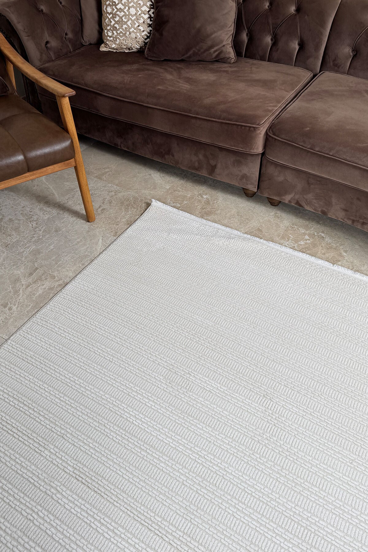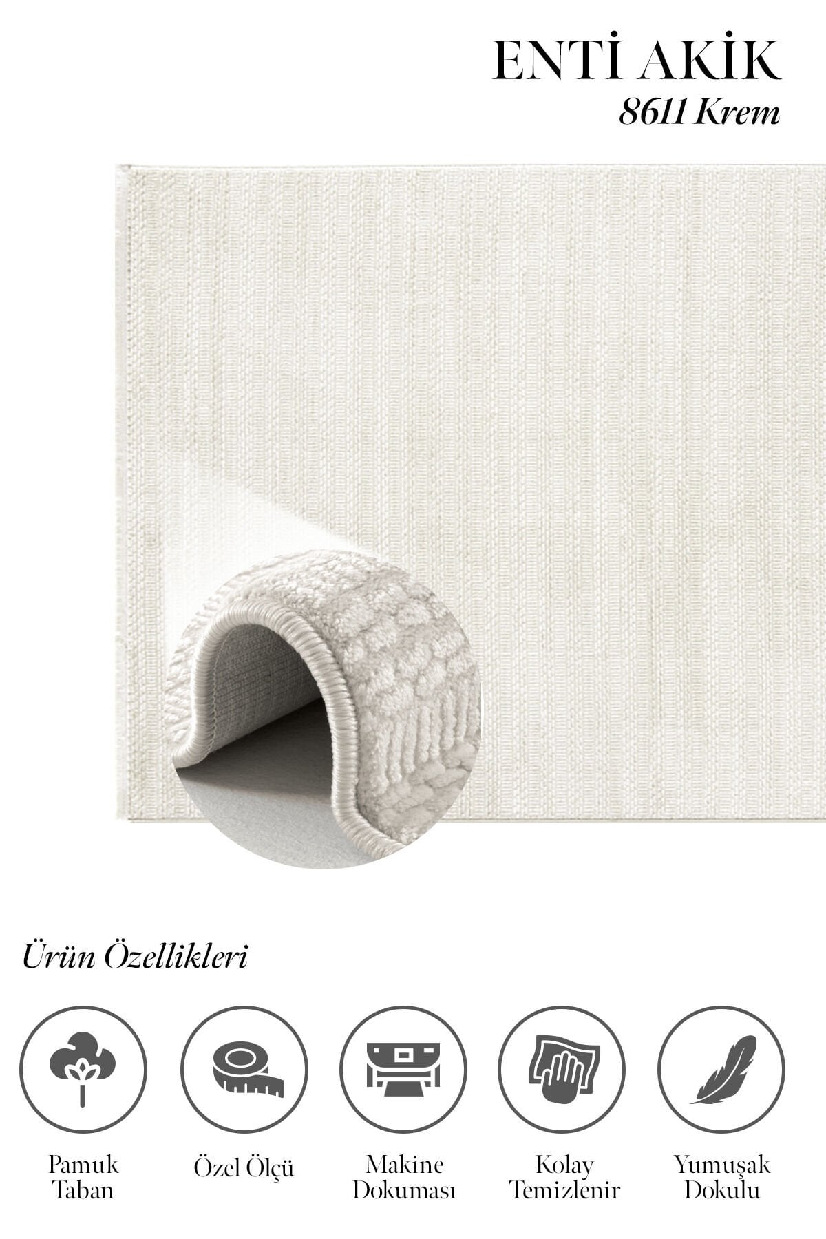 Akrilik iplik yapısı sayesinde hem şık bir duruş hem de konforlu bir kullanım sunan Enti Akik 8611 Krem, 11 mm hav yüksekliği ile adım attığınız anda yumuşaklık hissini yaşatır. Pamuk tabanı, zemine daha dengeli oturmasına yardımcı olurken kullanım konforunu artırır. Düz saçak detayı ise ürüne sade, modern ve temiz bir görünüm kazandırır.