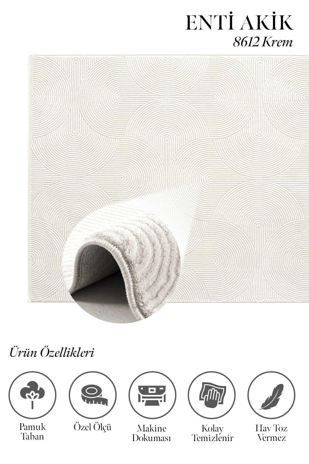 Akrilik iplik yapısı sayesinde hem şık bir duruş hem de konforlu bir kullanım sunan Enti Akik 8612 Krem, 11 mm hav yüksekliği ile adım attığınız anda yumuşaklık hissini yaşatır. Pamuk tabanı, zemine daha dengeli oturmasına yardımcı olurken kullanım konforunu artırır. Düz saçak detayı ise ürüne sade, modern ve temiz bir görünüm kazandırır.