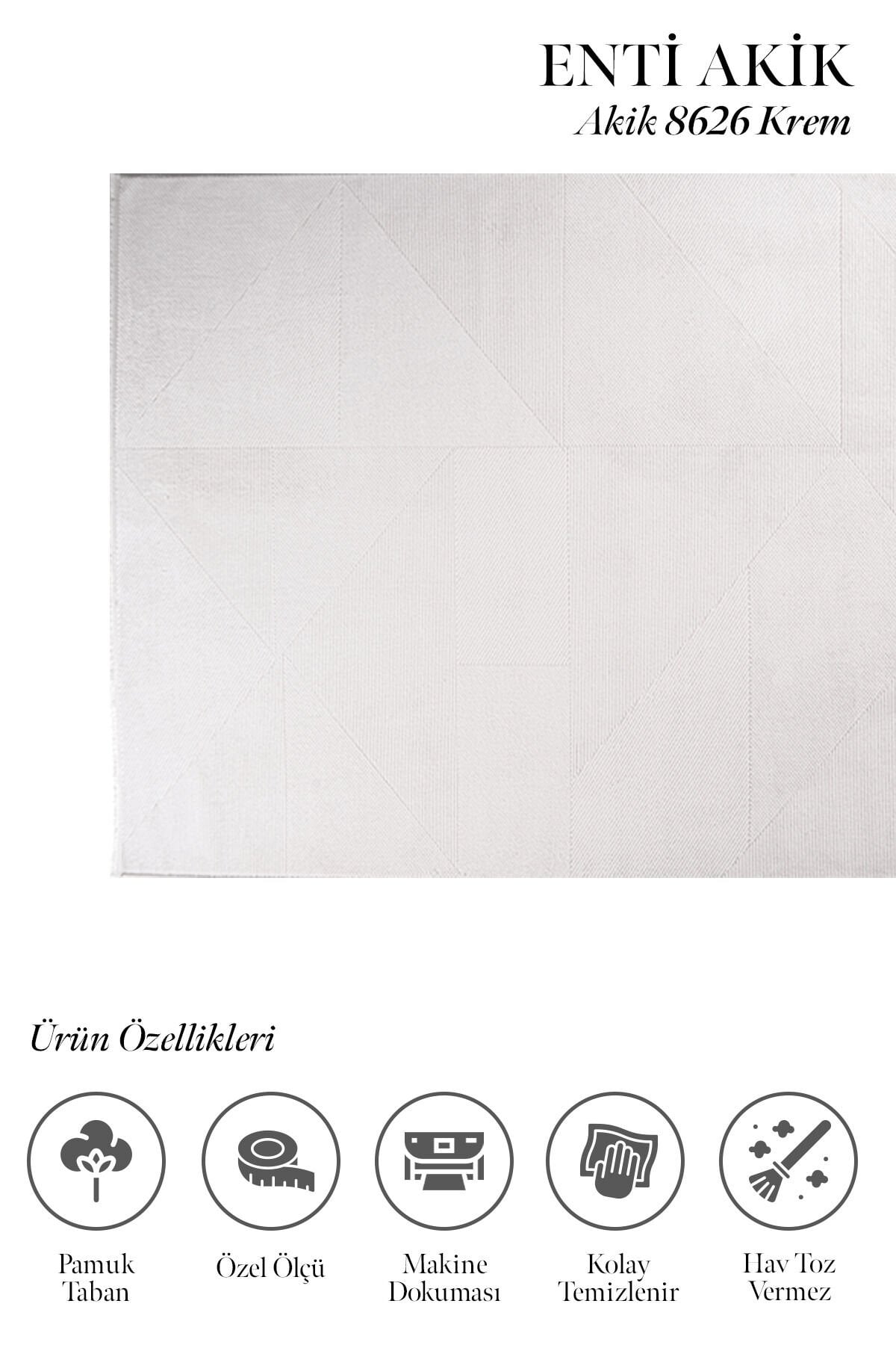 Akrilik iplik yapısı sayesinde hem şık bir duruş hem de konforlu bir kullanım sunan Enti Akik 8626 Krem, 11 mm hav yüksekliği ile adım attığınız anda yumuşaklık hissini yaşatır. Pamuk tabanı, zemine daha dengeli oturmasına yardımcı olurken kullanım konforunu artırır. Düz saçak detayı ise ürüne sade, modern ve temiz bir görünüm kazandırır.
