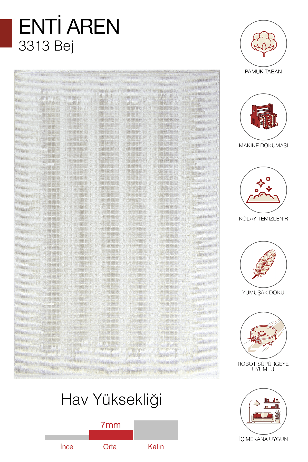 Akrilik iplik yapısı sayesinde yumuşak dokulu, konforlu ve dayanıklı bir kullanım sunar. Orta hav yüksekliği (6–12 mm), hem dolgun hem de günlük kullanım için ideal bir yapı sağlar. Pamuk tabanı sayesinde zemine sağlam tutunur ve uzun ömürlü kullanım avantajı sunar.