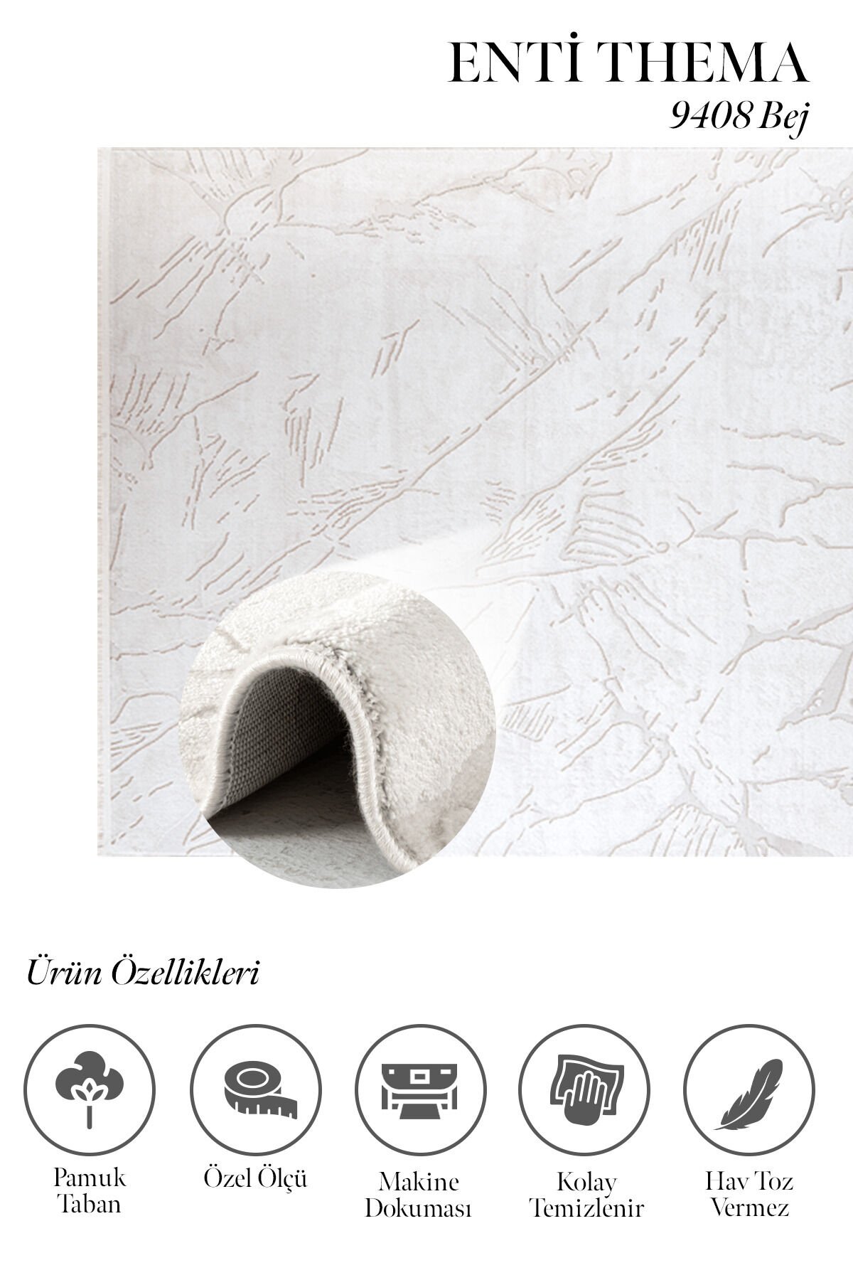 Salon, oturma odası, yatak odası ve antre gibi alanlarda rahatlıkla kullanılabilen Enti Thema 9408 Bej, özellikle açık renk mobilya ve soft dekorasyonlarla mükemmel uyum sağlar.