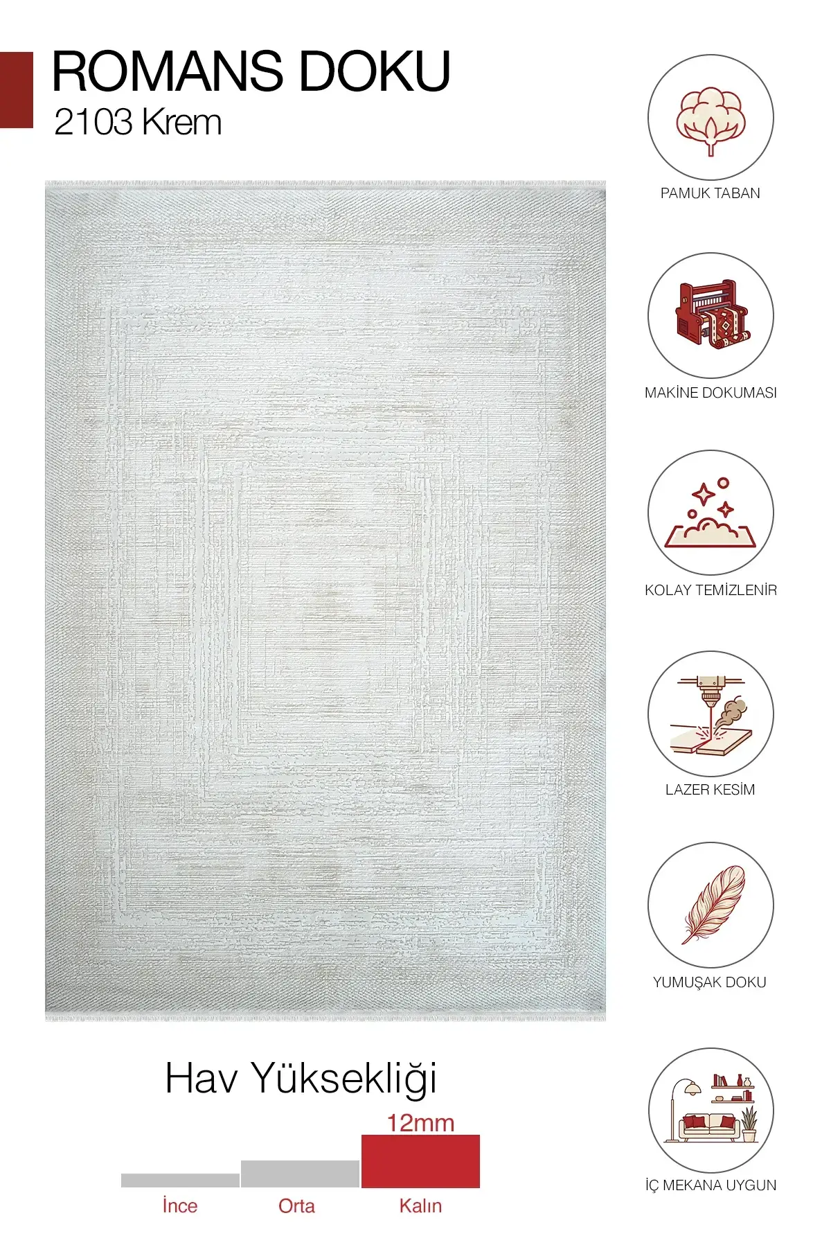 Özellikle modern, minimal ve soft dekorasyon sevenler için oldukça güçlü bir seçimdir. 600.000 PTS dokuma kalitesi ve 12 mm hav yüksekliği sayesinde hem göz alıcı hem de konforlu bir kullanım sunar.