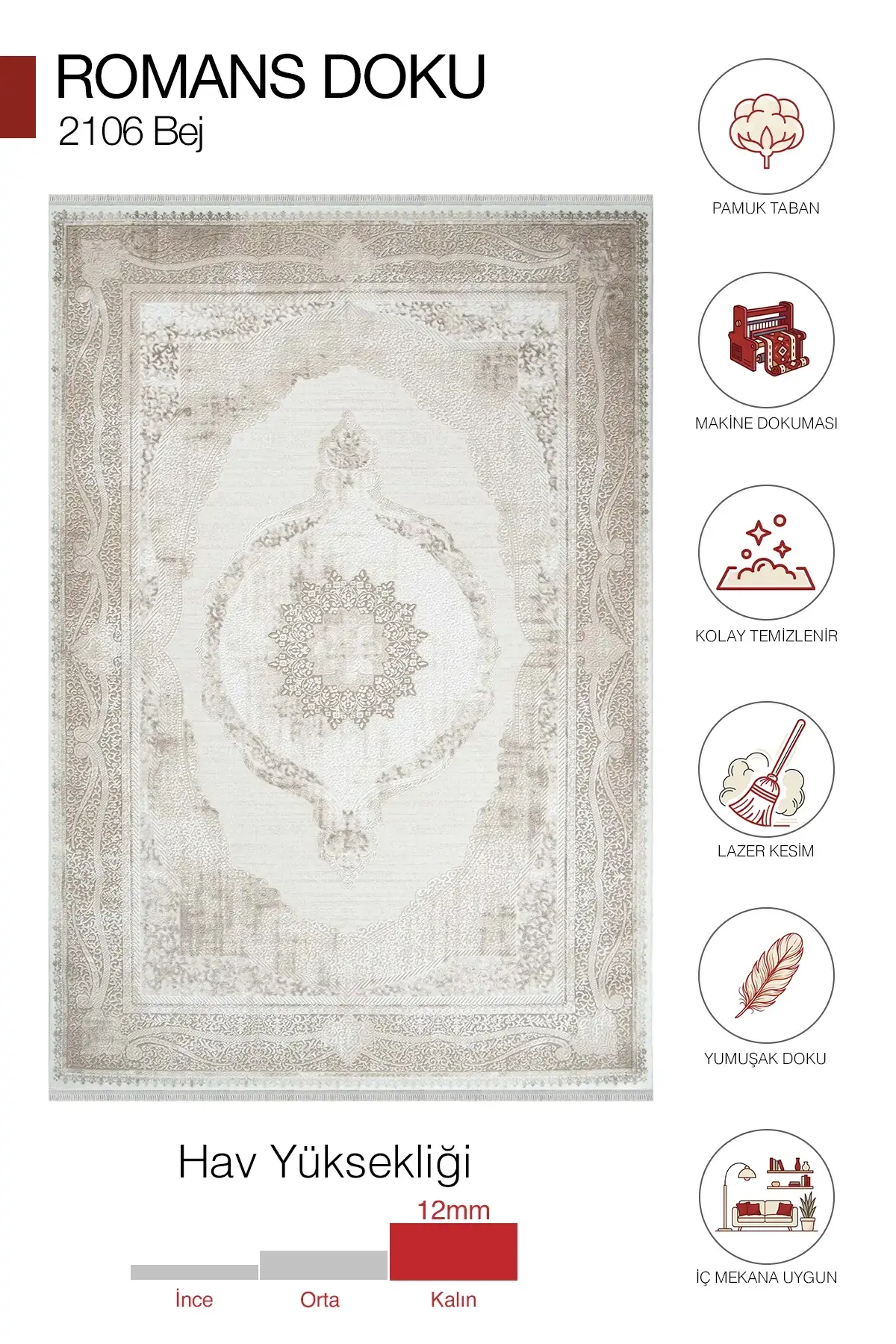Klasik çizgileri seven ama ağır bir görünüm istemeyen kullanıcılar için çok doğru bir tercihtir. 600.000 PTS dokuma kalitesi, 12 mm hav yüksekliği ve akrilik yapısıyla hem estetik hem de konforlu kullanım sunar.