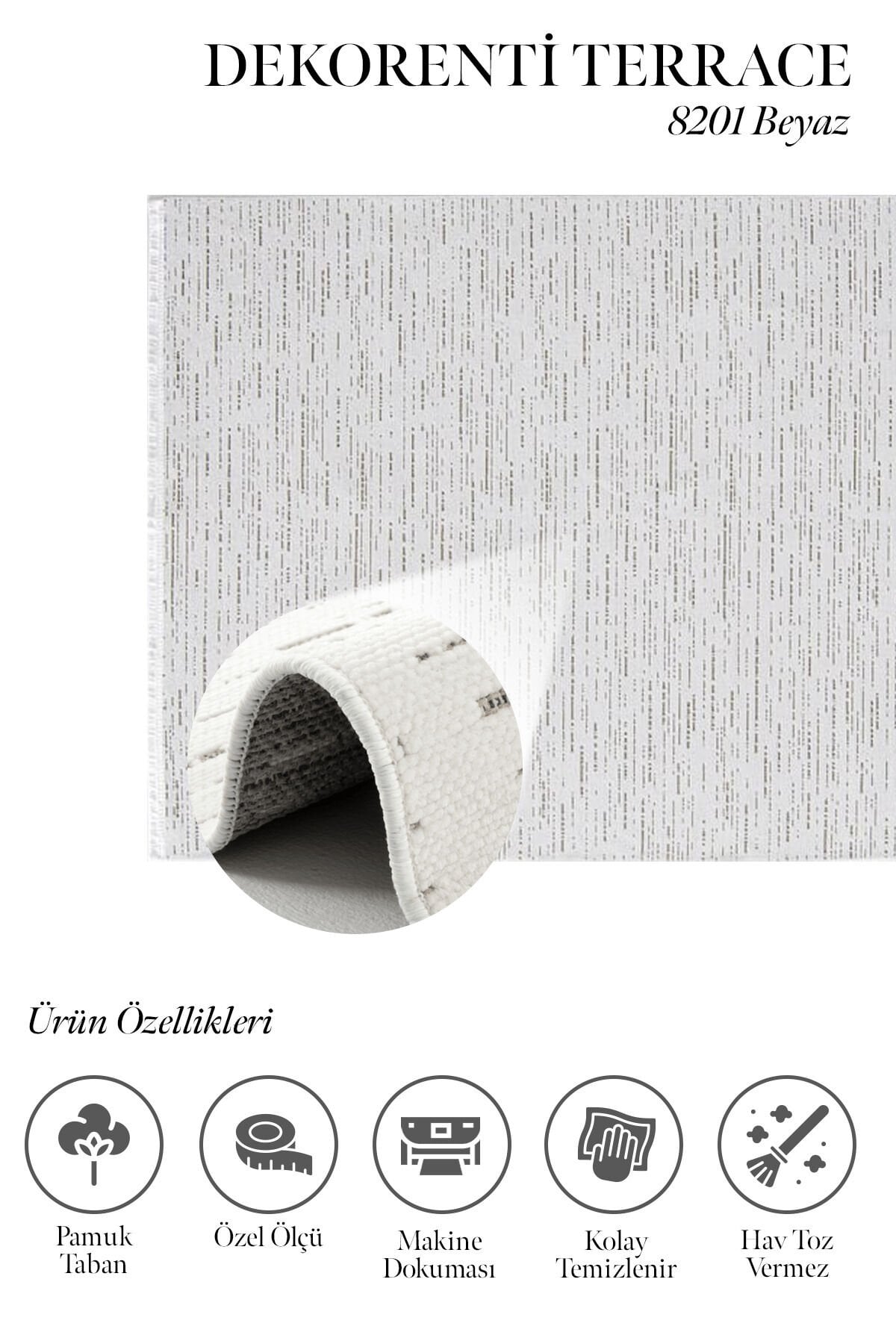 Dekorenti Terrace 8201 Beyaz; sadece koridor ve hol için değil, modern çizgili tasarımı sayesinde salon, oturma odası, yatak odası ve hatta balkon gibi farklı yaşam alanlarında da rahatlıkla kullanılabilir. İnce, kaymaz, kolay temizlenir ve dekoratif bir halı arıyorsanız Terrace Serisi tam size göre.