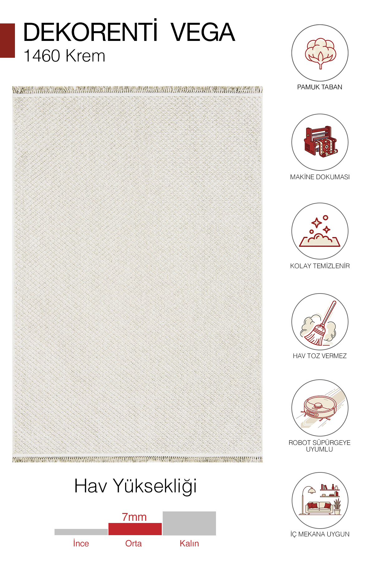 Pamuk tabanı zemine sağlam tutunurken, örgü saçak detayı halıya zarif ve doğal bir görünüm kazandırır.