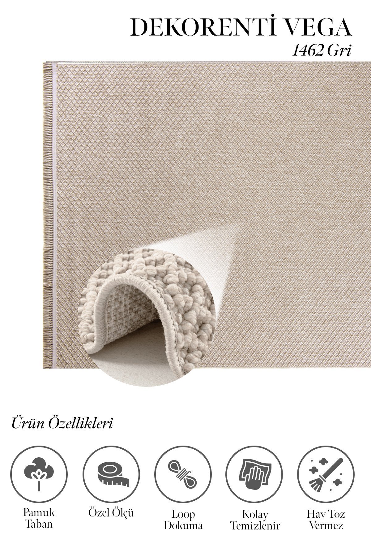 Pamuk tabanı zemine sağlam tutunurken, örgü saçak detayı halıya zarif ve doğal bir görünüm kazandırır.